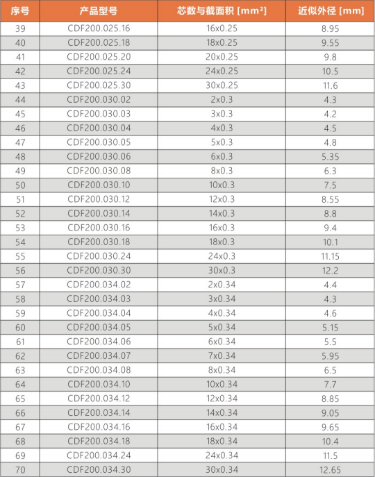 彎曲半徑 : 非拖鏈内運動:5.0X電纜外徑